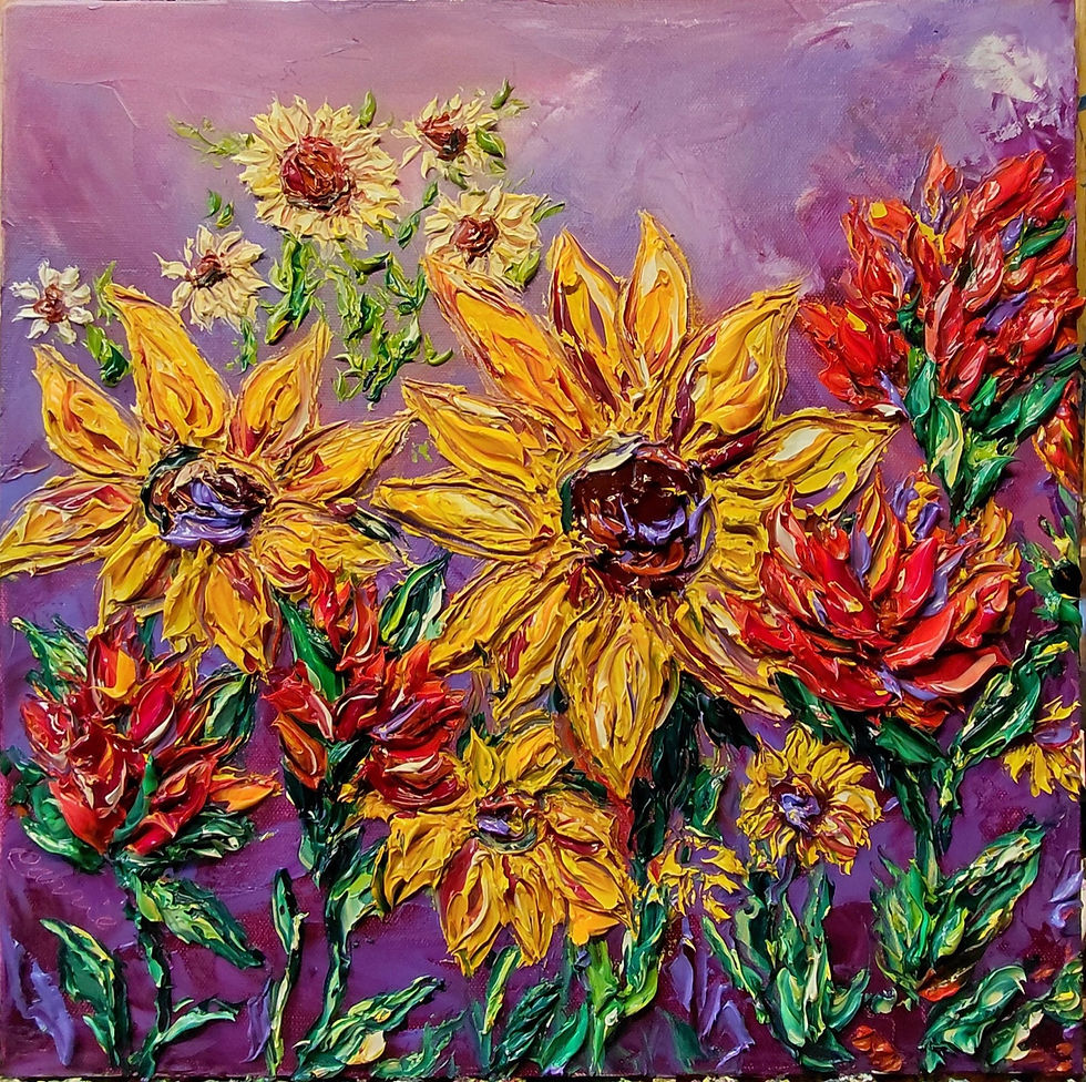 Each painting was created in the 3-D oil sculpting technique. The foundation is developed using traditional oil painting techniques. The sculptural sections of the work are created with a palette knife and are formed with pure archival quality oil paint. Once applied, the oil forms a thin “skin” to which a layer of glaze is applied forming a special coating that protects the paint while giving the sculpted areas the appearance of hand-blown glass. After a period of six to twelve months, a tough outer layer forms that is very durable. The inside of the heavily sculpted sections dry infinitesimally slowly, thereafter becoming fully dry after many years.